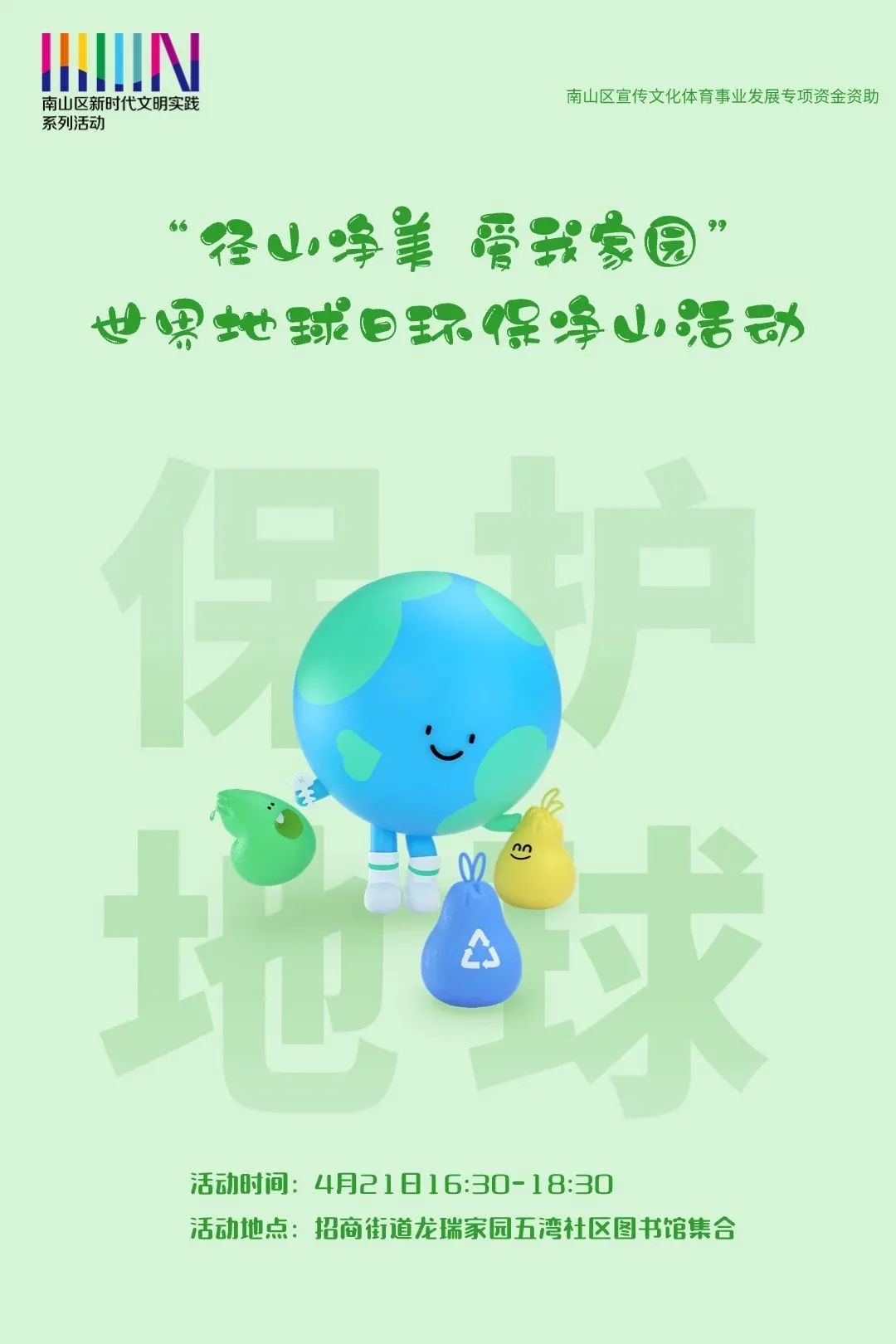 活動簡介:4月22日是第55個世界地球日,為深入宣傳貫徹習近平生態文明思想,引導全社會踐行生態文明理念,南山區新時代文明實踐中心聯合區生態環保青年志愿者協會開展“徑山凈美 愛我家園”環保凈山志愿服務活動,組織志愿者徒步前往大南山公園學習生物多樣性知識,并在沿途開展環境清掃、環保宣傳志愿服務。