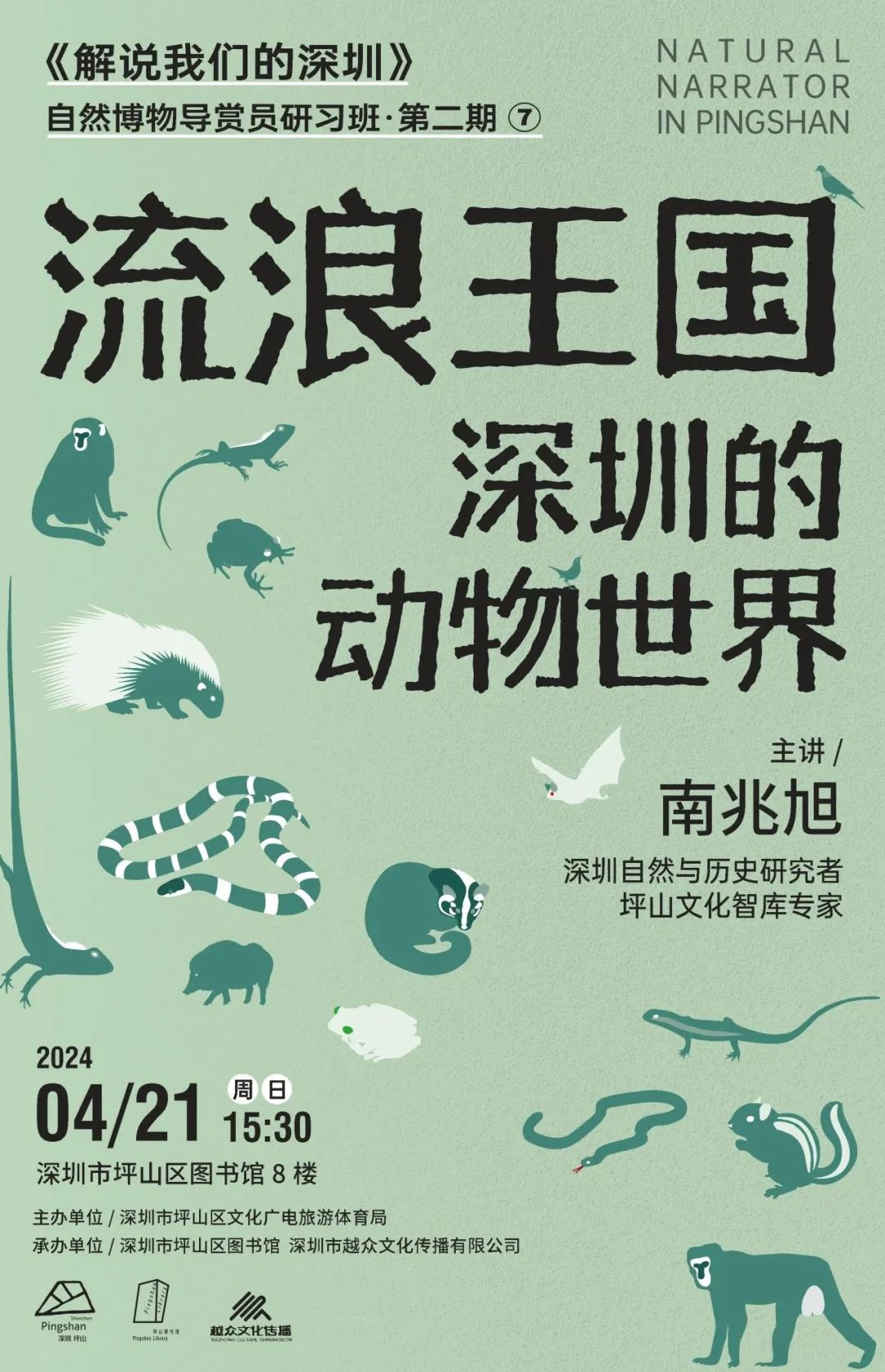 活動簡介:山海連城的深圳,有山嶺和密林,有海洋和濕地,有河流與湖泊,它們中間隱居著各種各樣的生命。深圳有2萬多種動物,它們如何在都市的周邊生存?它們有哪些神奇的故事?本周日下午,聽南兆旭老師介紹那些低調而隱秘的“另類居民”,講述它們的喜怒哀樂、生老病死以及與我們深圳人的萬千關聯。讓我們一起探索深圳的動物世界,發現超級都市里的隱秘王國。