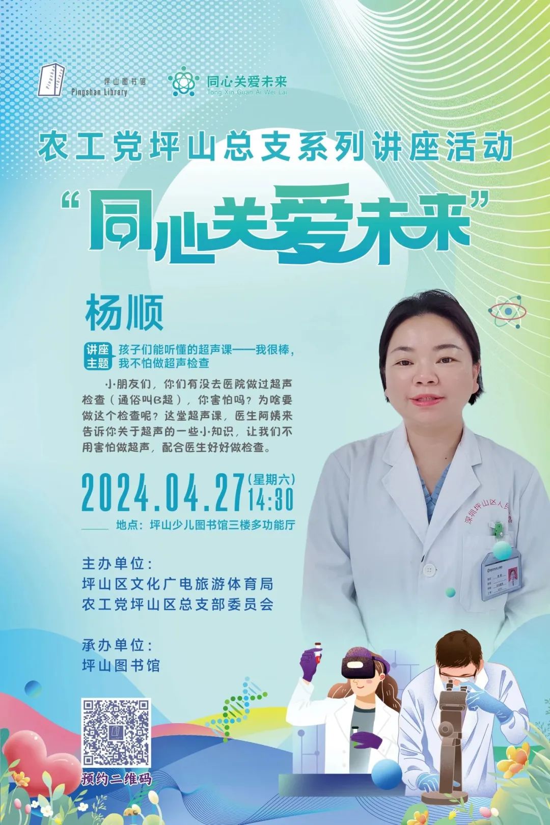 活動簡介:“同心關愛未來”系列活動是坪山區文化廣電旅游體育局與農工黨坪山區總支部委員會聯合打造的一項兒童科普閱讀品牌。該活動充分發揮農工黨坪山區總支部委員會界別特色和專業優勢,采用兒童喜聞樂見的方式,科普常見醫學健康專業知識 。活動自2024年4月起,以每月一期的頻率,在坪山少兒圖書館定點舉辦。