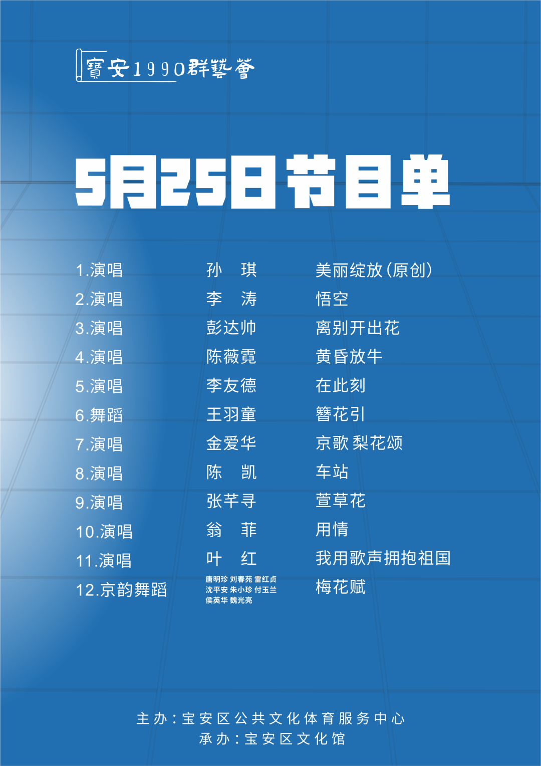 活動(dòng)簡介:《90群藝薈》致力于豐富寶安區(qū)群眾的文化生活,促進(jìn)群眾文化的繁榮發(fā)展,寶安區(qū)文化館通過搭建專業(yè)公益舞臺(tái),為文化藝術(shù)愛好者提供免費(fèi)展演平臺(tái),同時(shí)為專業(yè)人士提供宣傳和交流的機(jī)會(huì),共同推動(dòng)寶安區(qū)文化藝術(shù)事業(yè)的蓬勃發(fā)展。