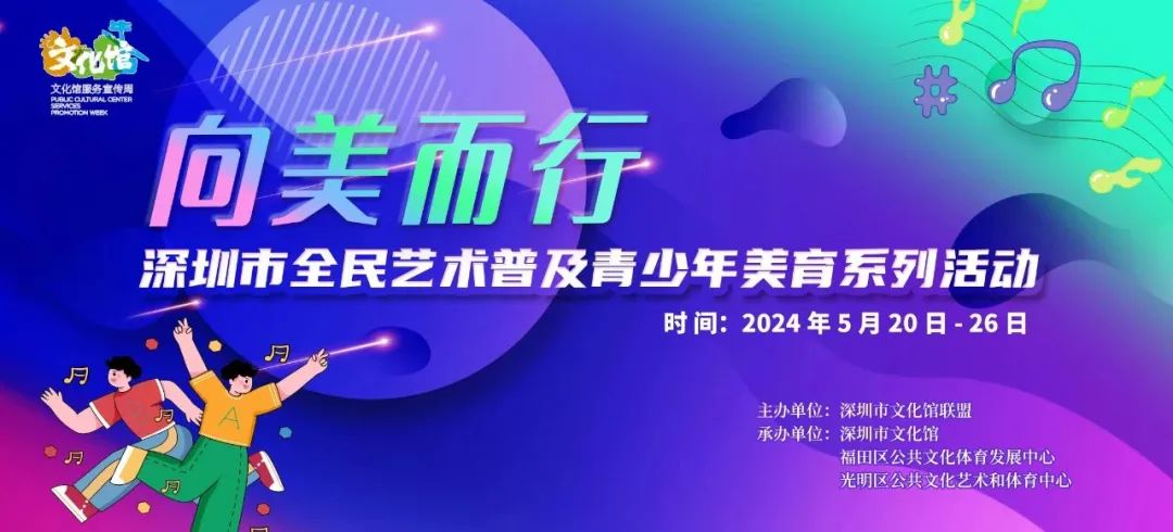 活動(dòng)簡介:為做好2024年文化館服務(wù)宣傳周各項(xiàng)工作,凝聚文化館行業(yè)力量、提升行業(yè)影響力,擴(kuò)大活動(dòng)覆蓋面、參與度,深圳市文化館聯(lián)合深圳市青少年活動(dòng)中心共同策劃舉辦“向美而行”深圳市全民藝術(shù)普及青少年美育系列主題活動(dòng),助力全民美育。整個(gè)宣傳周活動(dòng)分享活動(dòng)、看演出、聽音樂、學(xué)才藝、賞展覽等系列活動(dòng)。