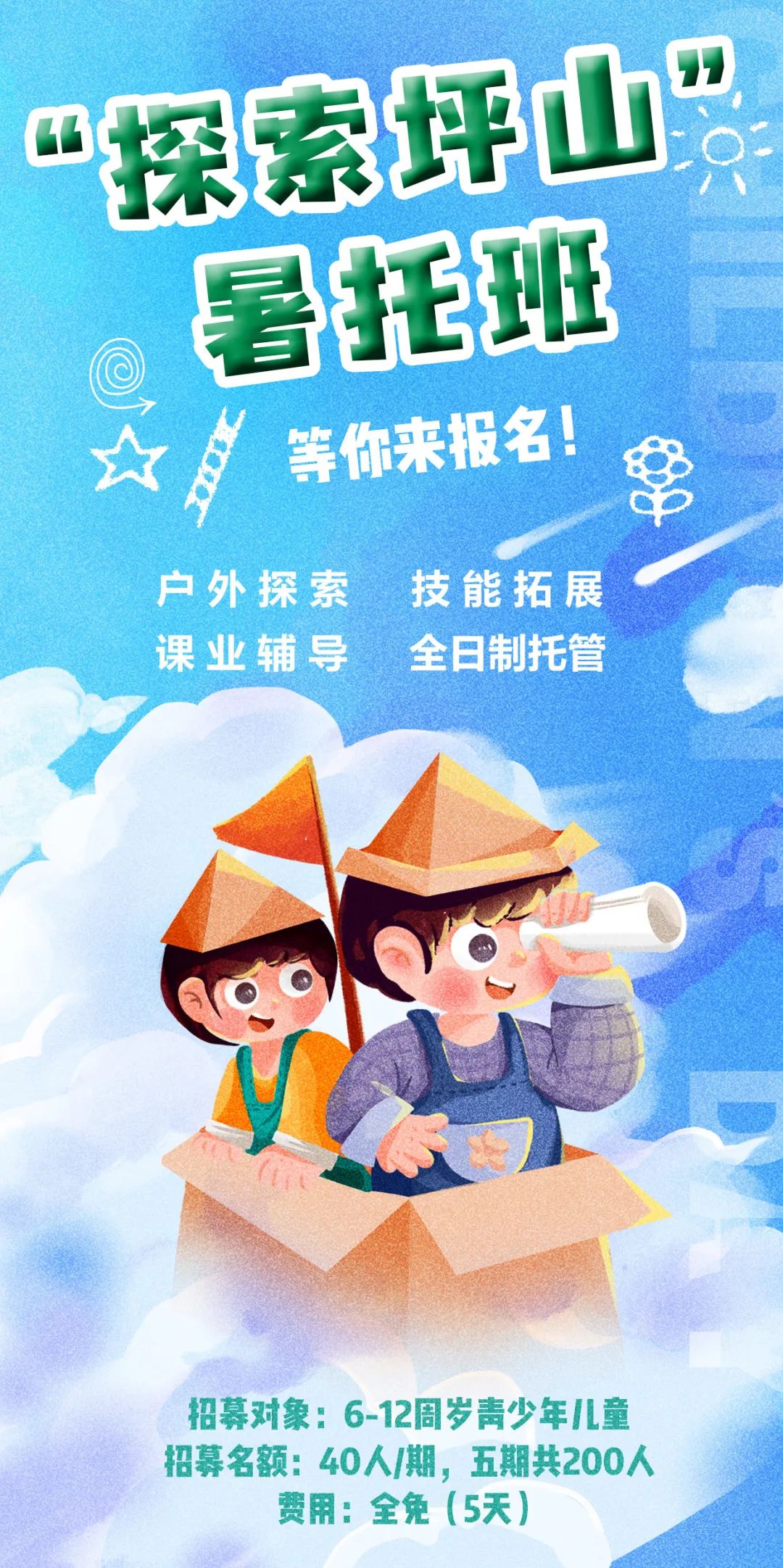 活動簡介:坪山區群團工作部、區教育局聯合區工業和信息化局、區文化廣電旅游體育局、區城市管理和綜合執法局開展“探索坪山”暑托班,帶領小朋友了解坪山、愛上坪山,度過一個安全、豐富且意義非凡的假期。五大主題,多種課程,漫步坪山,寓學于樂,讓小朋友的暑期日記不再沒有話題!