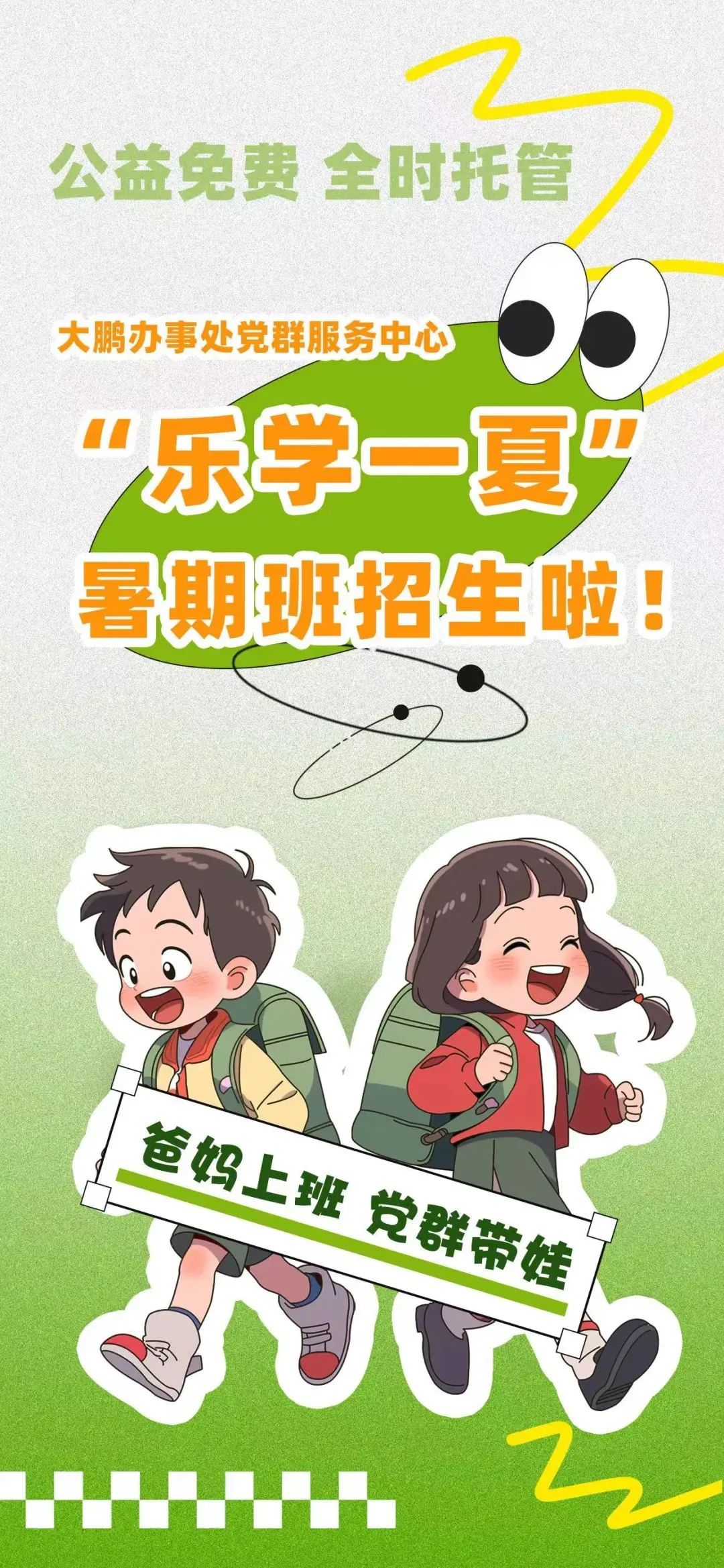 活動簡介:暑假來了,孩子看護成難題?暑期作業輔導成煩惱?如何為孩子開啟一段歡快的暑期之旅?別擔心,大鵬辦事處黨群服務中心備好了解憂良策。面向大鵬辦事處轄區1-6年級(7-12周歲)學齡期兒童青少年開設兩期全時托管班。尤克里里、陶笛、書法、手抄報、科技創意實踐、二十四節氣非遺手工、紅色電影、趣味課堂、作業輔導……在這里,孩子們將體驗多元化智趣課堂活動,練就“十八般武藝”,德智體美勞全面綻放。