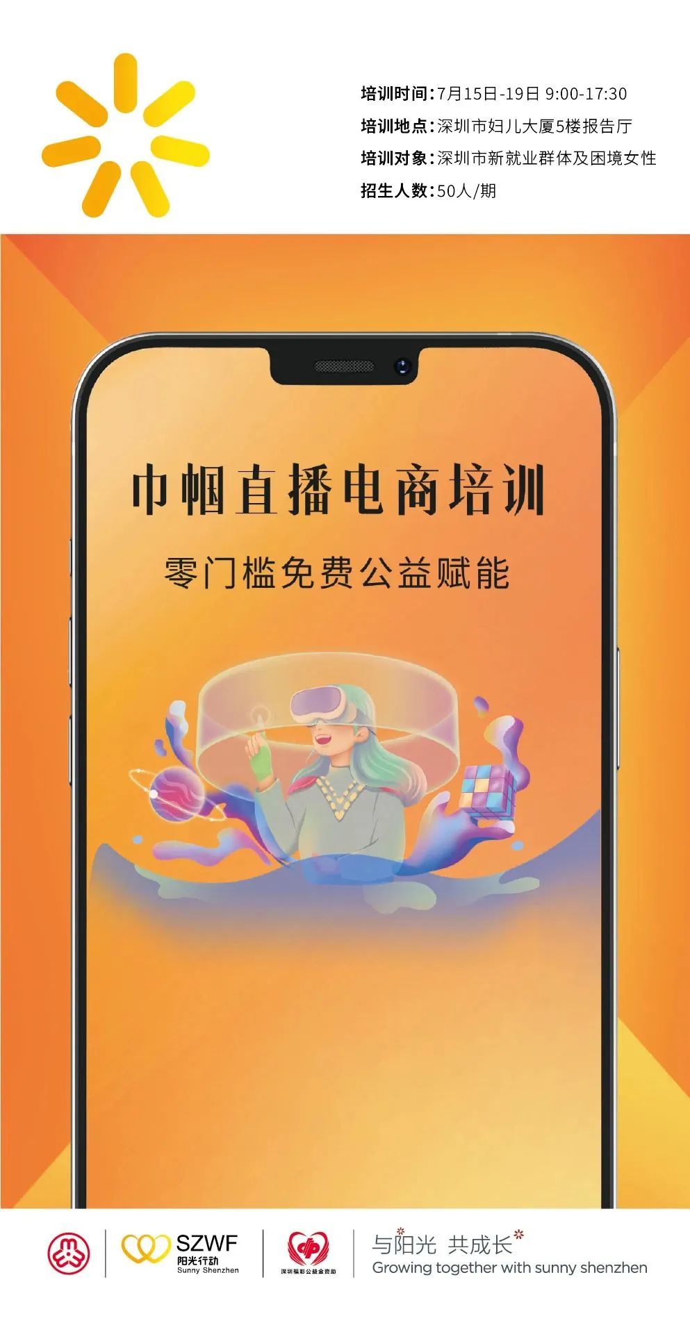 活動簡介:為助力女性就業創業,深圳市婦聯推出“巾幗直播”電商就業創業賦能項目,通過學習巾幗直播電商就業創業幫扶公益課程,掌握直播帶貨技能,為新就業群體及困境女性拓寬就業渠道,創造就業機會。
