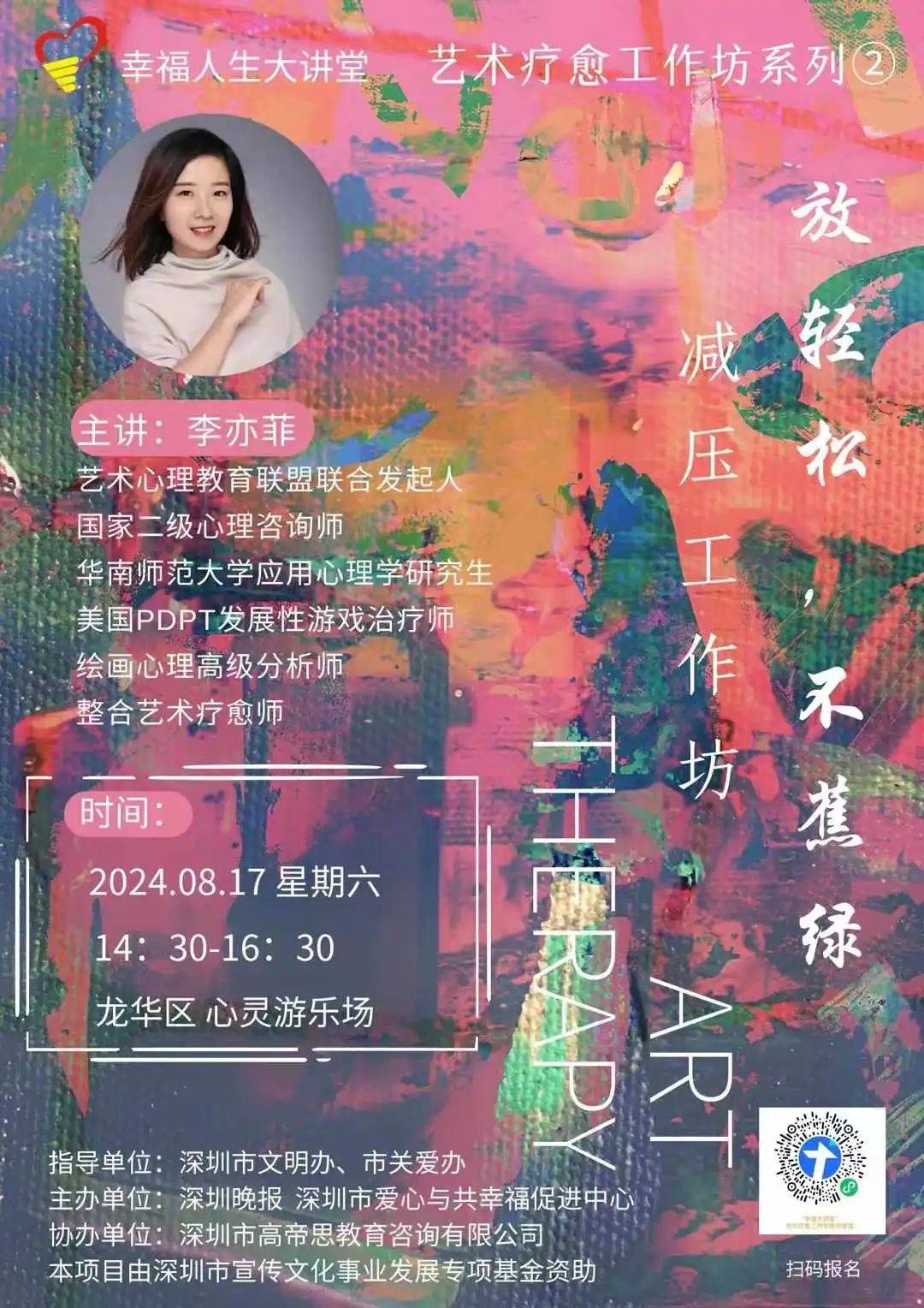 活動簡介:“幸福人生大講堂——藝術療愈”系列第二課特別籌備了一場藝術療愈減壓工作坊,旨在通過色彩、線條與形狀的魔法,引領您步入一場心靈的深度放松之旅。