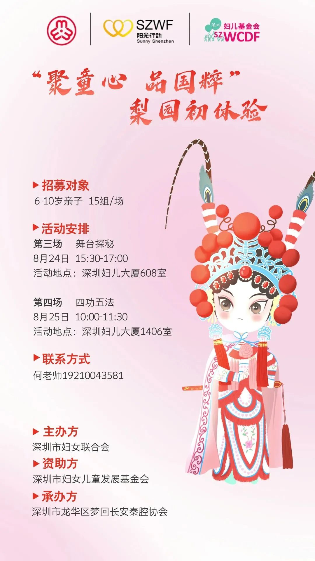 活動簡介:頭面點翠,扇底描金,戲臺聲聲傳千古,唱念做打技藝全,戲曲凝結(jié)著中國人的智慧,有著超越時空的思想魅力。這個周末,歡迎您帶著孩子來婦兒大廈走進戲曲藝術,通過華美戲服、道具樂器以及云手、慢走、臺步等戲曲身段步法學習體驗,感受梨園藝術魅力。