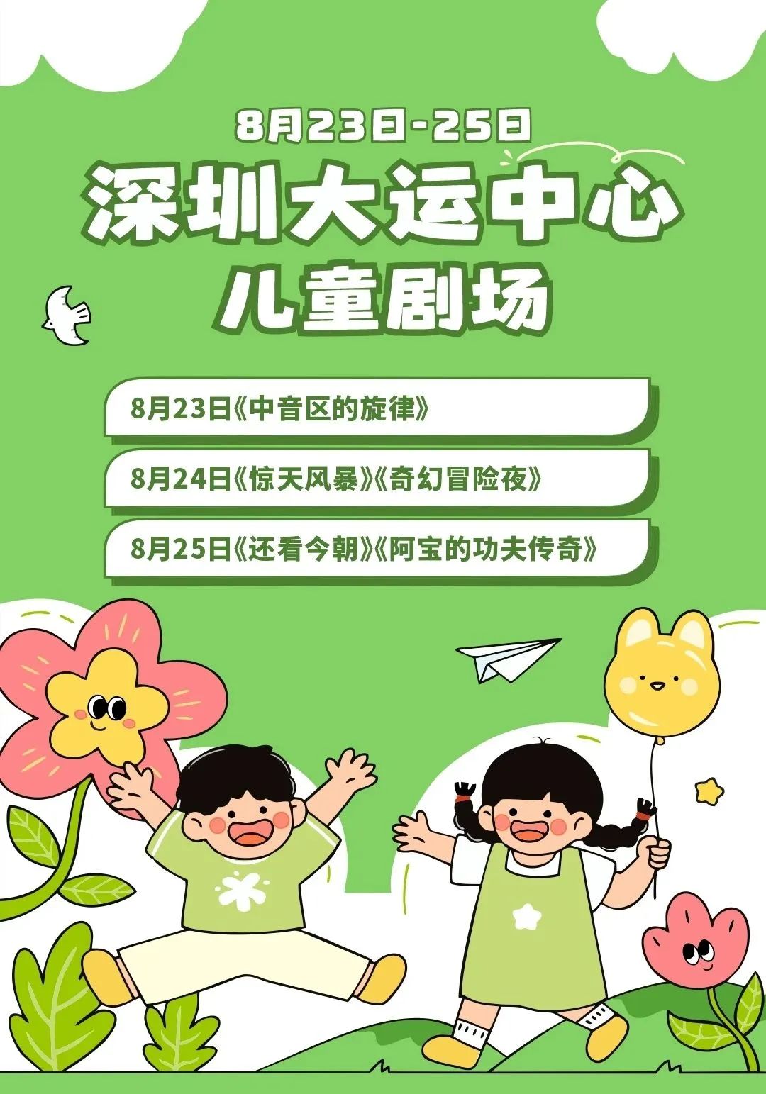活動簡介:8月23日-8月25日深圳大運中心兒童劇場再度來襲,5場公益演出輪番上演為孩子提供一段難忘的假期時光。本次活動共提供1100張兒童劇場公益門票 。