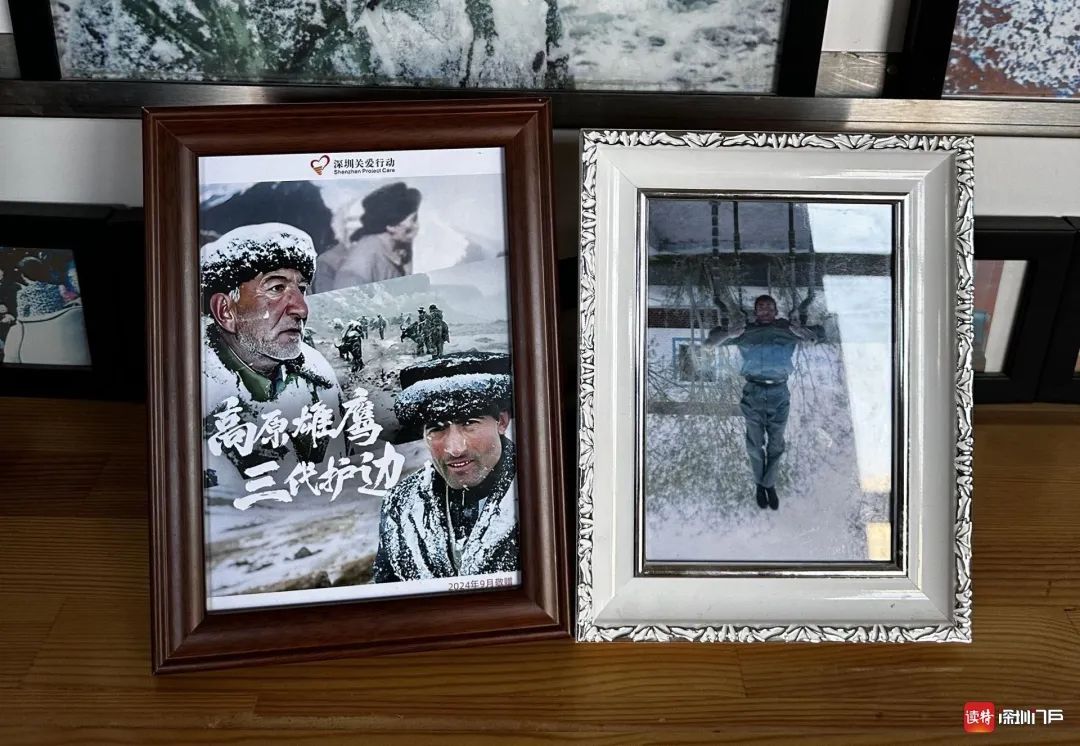 在巴依卡家的陳列室里,深圳市關(guān)愛行動組委會辦公室贈送的《高原雄鷹 三代護邊》的海報被擺在拉齊尼照片的旁邊。海報中是巴依卡家的三代護邊員:中間是巴依卡·凱力迪別克,上方是父親凱力迪別克·迪力達(dá)爾,下方是兒子拉齊尼·巴依卡。