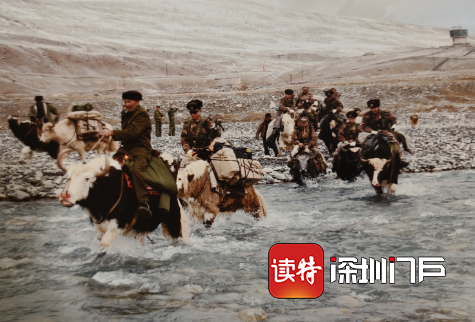 巴依卡早年騎著牦牛蹚河巡邊的資料照片。
