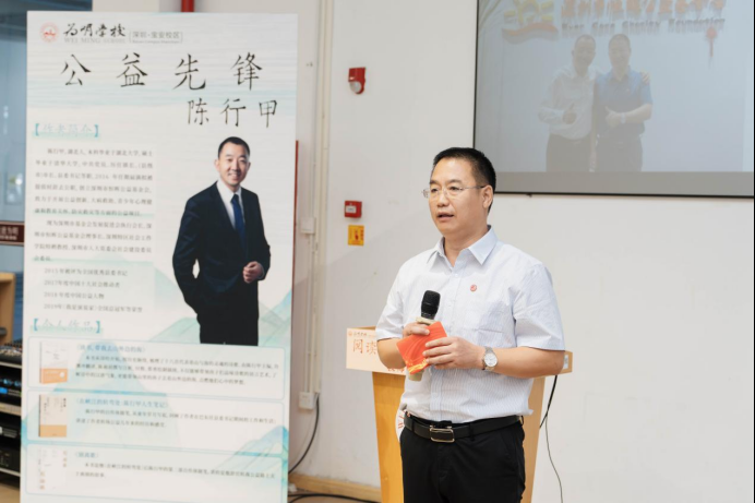 在教師個人閱讀心得分享環節,初中部主任段占忠代表全體老師用文字走近陳行甲,他講述了陳行甲發起的“聯愛”“知更鳥計劃”“傳薪計劃”等多個公益項目,贊嘆陳老師是教育的同行者,更是先進教育理念的領跑者,因此特聘陳行甲老師為寶安為明學?!敖逃骖I航導師”。