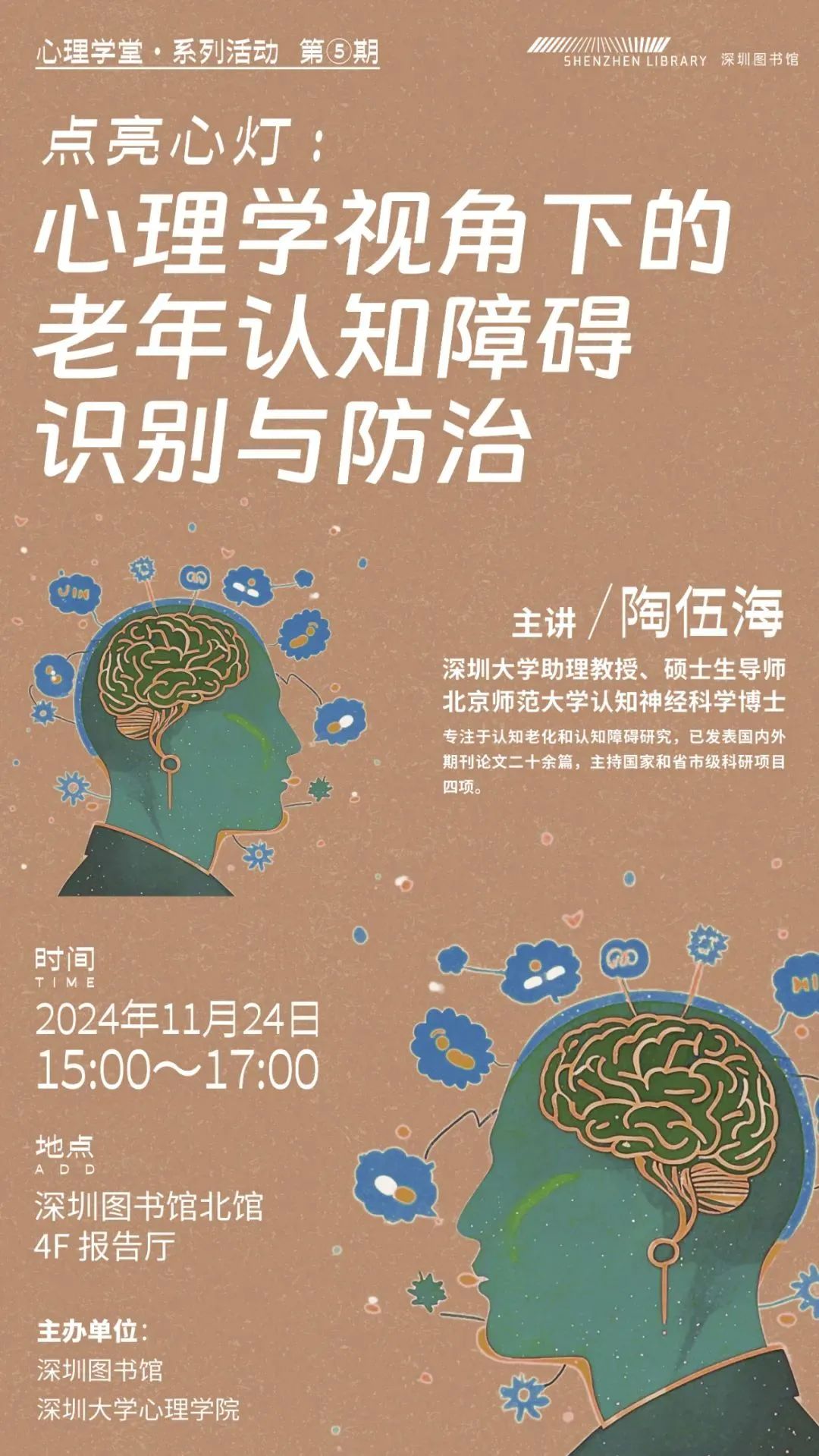 活動簡介:在人口老齡化的當下,老年人的認知健康成為了全社會關注的焦點與科學研究的熱點。本期心理學堂,邀請到了深圳大學心理學院陶伍海教授,他將引領我們深入了解老年認知的奧秘。