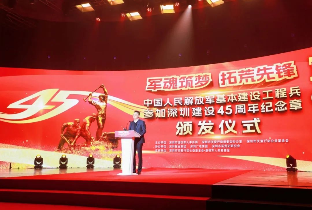 市退役軍人事務局黨組書記、局長商澎濤在致辭中表示,45年前,2萬基建工程兵肩負國家重托,拓荒邊陲小鎮,建設深圳經濟特區。他們把軍魂融入這座城市的基因血脈,成為“敢闖敢試、敢為人先、埋頭苦干”特區精神的重要組成部分,激勵著后來的建設者們不斷前行。紀念章的頒發正是對他們無畏勇氣的崇高敬意,對其無私奉獻的深情銘記,對其無悔付出的真摯感恩。它承載著深圳人民對他們的感激,也彰顯著這座城市對2萬基建工程兵功績的認可。他激勵老兵們繼續傳承和發揚基建工程兵的優良傳統,發揮余熱,老有所為,以基建工程兵群體中涌現的全國模范退役軍人劉坤德、廣東最美退役軍人黃干達、深圳最美退役軍人周順斌、沈遠彪等先進典型為榜樣,以更大熱情弘揚“拓荒牛”精神,為深圳的建設發展再出發、再奮斗、再添彩。