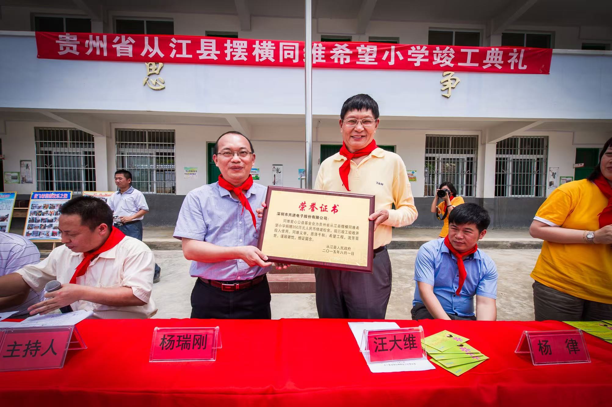 汪大維關注校舍建設之余,也重視解決孩子們的實際困難。2011年,一場大火導致貴州省從江縣停洞鎮擺橫小學的校舍傾塌,師生們只能在臨時板房中上課。2014年3月,汪大維決定重建該校。苗鄉山高路陡,他親自帶領公司的基建隊伍勘察新校址。當時山區尚未完全通自來水,但為改善近四百名師生的生活條件,汪大維克服重重困難,堅持按寄宿制標準,為教室和宿舍修建自來水系統,并依照現代化標準建起了教學樓、宿舍樓和食堂。