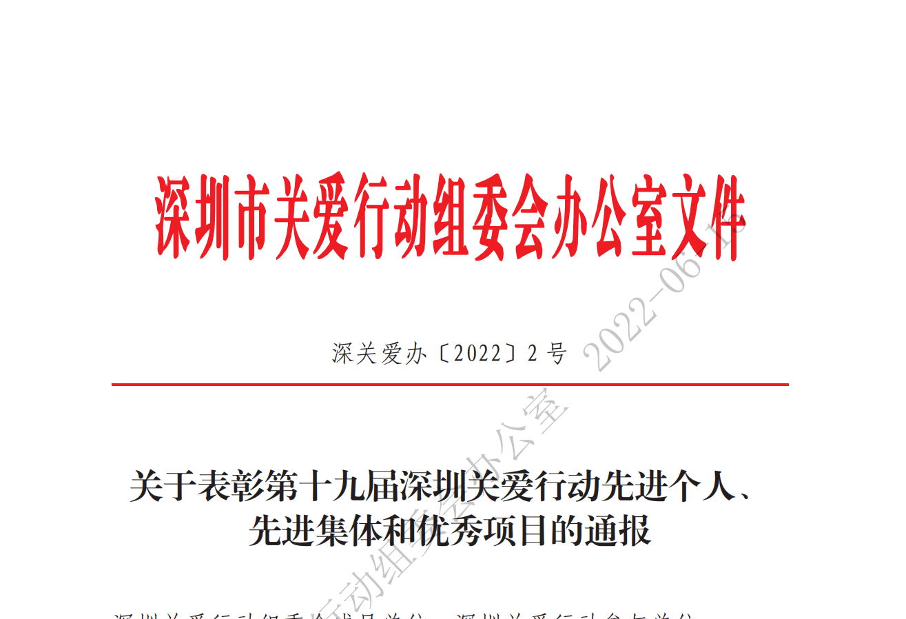 關于表彰2018深圳關愛行動先進個人、先進集體和優秀項目的通報